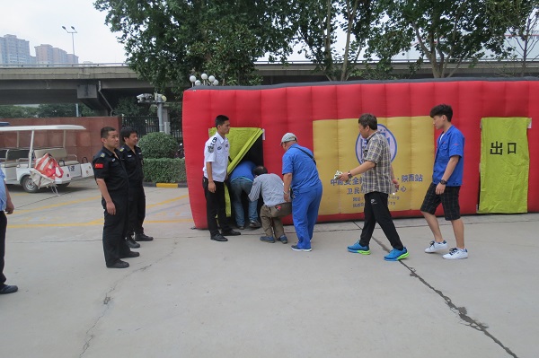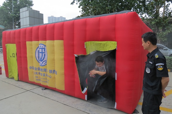 27日上午,逼真式逃生演练活动正式开始,西高院办公大楼前搭建了消防模拟“逃生帐篷”,安技保卫处组织参与活动人员到达弥漫浓烟的逃生帐篷外,首先,由专职教员讲解进入帐篷的注意事项,然后带领大家分批分次的进入帐篷开启体验之旅,帐篷内设有隔断墙,将内部分隔成迂回曲折的走道空间,为迷宫形式,并分开设置1个进口和1个出口,进出口上设有遮光用的门帘,具有封闭、黑暗、浓烟等特点,每个人在烟雾缭绕的模拟帐篷内真实的感受着火灾发生时的现场状态。“蹲下、捂鼻子、按照帐篷内的标识找出口……”在浓烟密布的模拟帐篷内,专职教员指导着所有人员“火里逃生”。