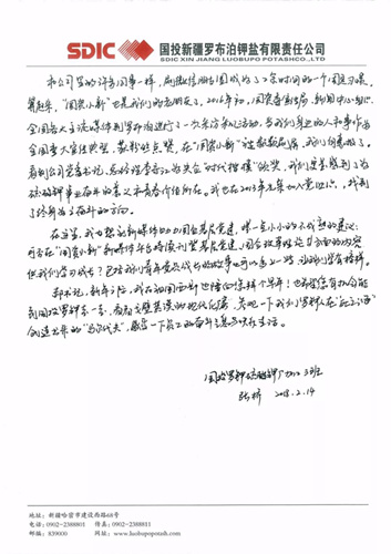 郝书记,希望您有机会能到国投罗钾来走一走,看看戈壁荒漠的现代化厂房,参观一下我们罗钾人在“死亡之海”创造出来的“马尔代夫”,感受一下员工的奋斗气息与快乐生活。