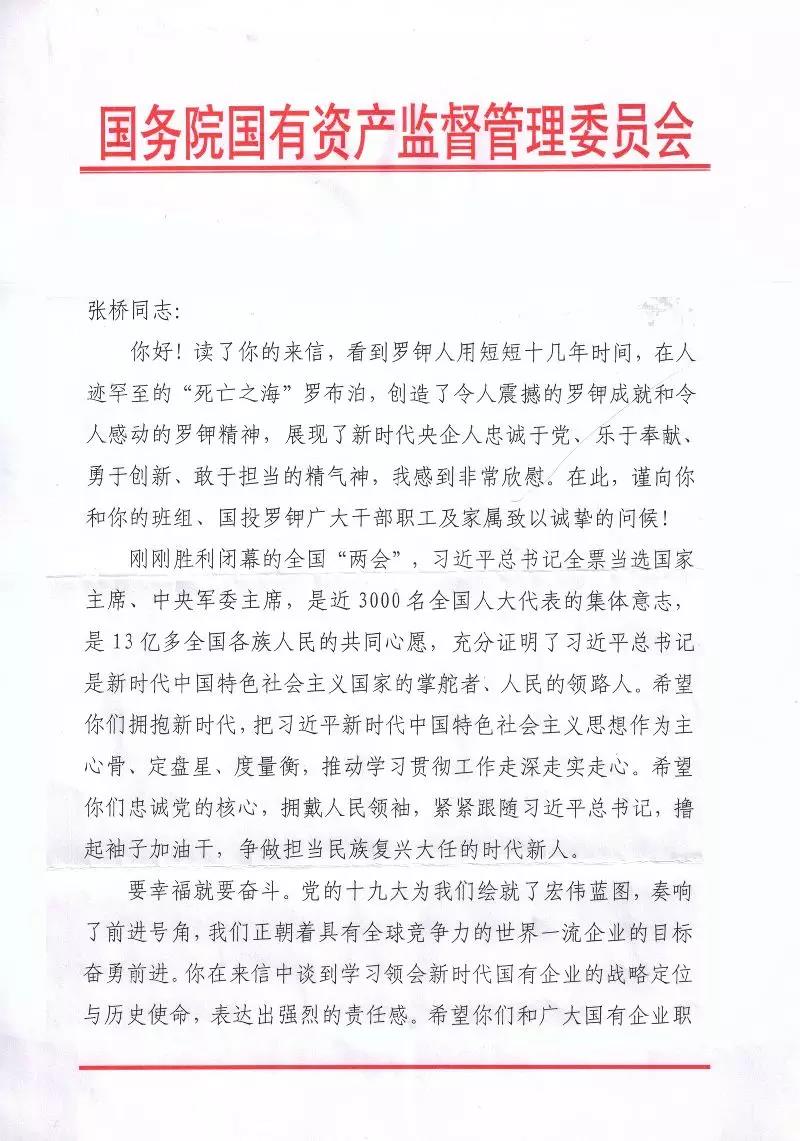 我是国投新疆罗布泊钾盐有限责任公司的一名普通的85后员工。前几天,通过“国资小新”微信看到了您在接受《求是》杂志专访的《新时代国有企业的战略定位与历史使命》文章,受益匪浅。您的思考,通篇贯彻着习近平新时代中国特色社会主义思想,为我们讲述了新时代国有企业的战略定位、历史使命和改革发展的新目标新举措,不仅解开了我们基层员工的一些思想困惑,也指明了我们国企未来的发展方向。所以,就想通过写信的方式和您交流一下学习心得。