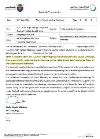 2024年9月27日,西高院收到迪拜水电局DEWA印发的书面文件,表示XIHARI已获得DEWA对高压GIS型式试验的直接认可,标志着西高院高压GIS的试验报告无需通过其他机构认证,能够直接应用于阿联酋迪拜电力行业。