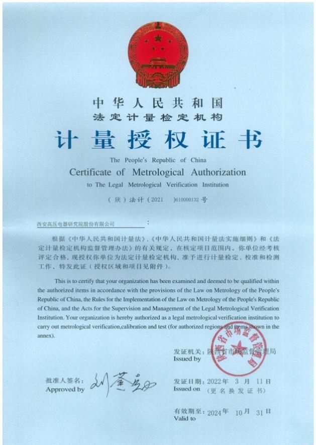 计量是西高院多项业务中的一项内容。西高院为原机械工业第五计量测试中心站(西安),是国家机械工业部(原机械电子工业部)1990年正式批准成立的第一批专业计量中心站,是中国合格评定国家认可委员会认可的校准实验室(认可注册号:CNAS L0223)和陕西省市场监督管理局依法授权的法定计量机构(授权证号:(陕)法计(2021)610000132),同时还是国家市场监督管理总局授权的国家测量互感器型式评价实验室,国家批筹建立的国家输配电装备产业计量测试中心,陕西省批筹建立的陕西省电力装备产业计量测试中心。