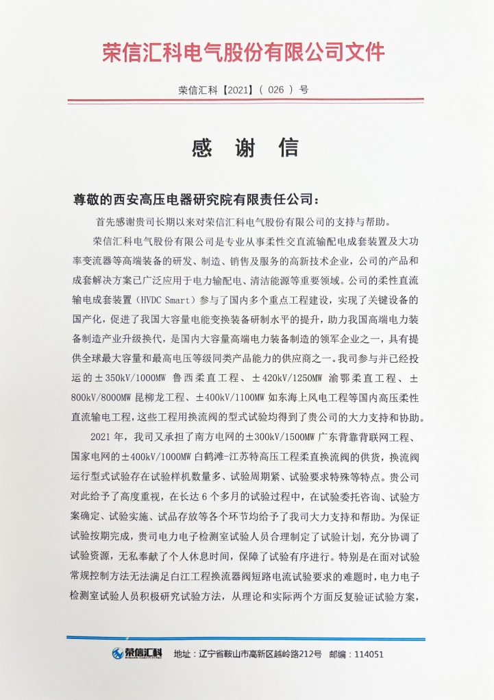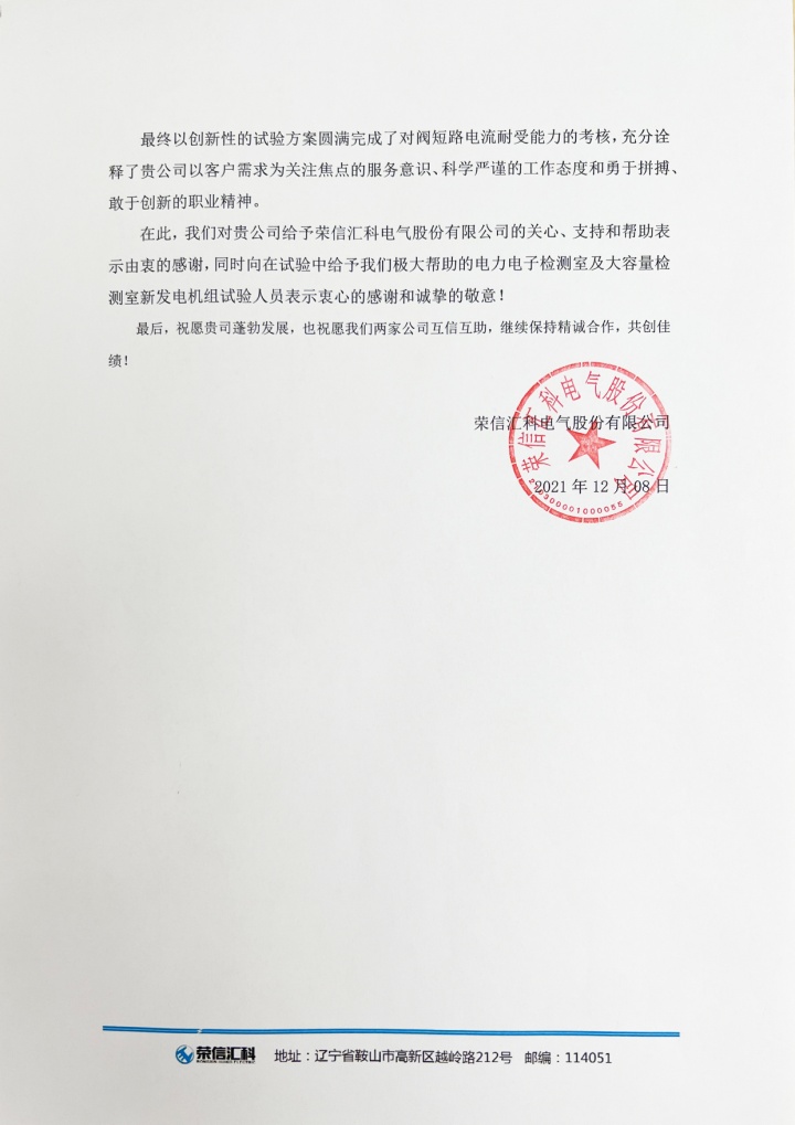 此次运行试验得到了客户的高度肯定,我院收到了来自客户的感谢信。