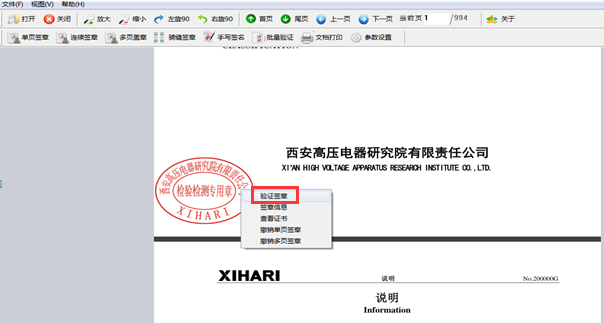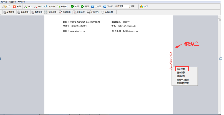5)光标移动到印章(正文章或骑缝章)上点鼠标右键,选择验证签章,如下图: