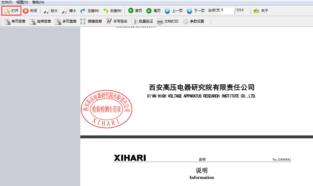 4)单击文件打开按钮,选择需要验章的电子报告文件。