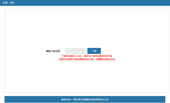 点击报告下载按钮,验证码将发送至办理委托时预留的手机号码,输入验证码即可下载电子签章报告: