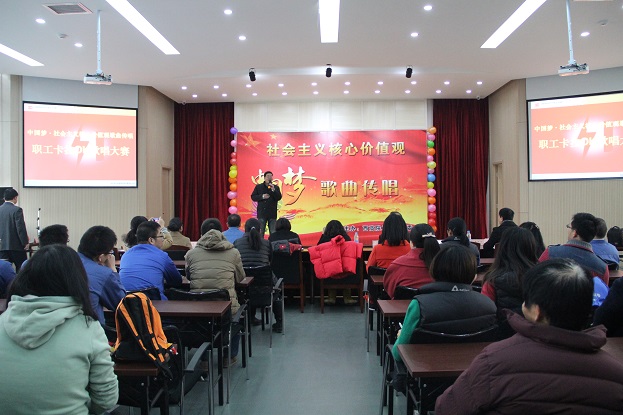 为了积极培育和践行社会主义核心价值观,不断巩固全体职工团结奋斗的思想道德基础,丰富职工的业余文化生活,展示职工的精神风貌和热爱祖国、歌唱祖国的美好情怀,我院工会、团委联合开展以“中国梦·社会主义核心价值观歌曲传唱”为主题的职工卡拉ok比赛活动。我院党委副书记许日参加活动,并致词。