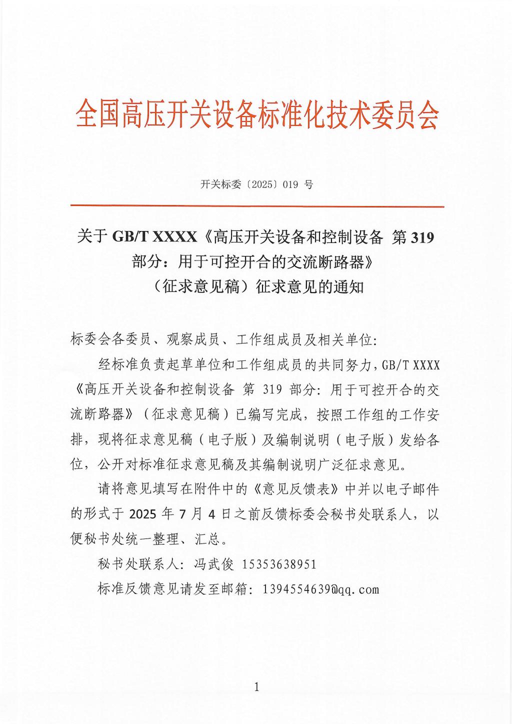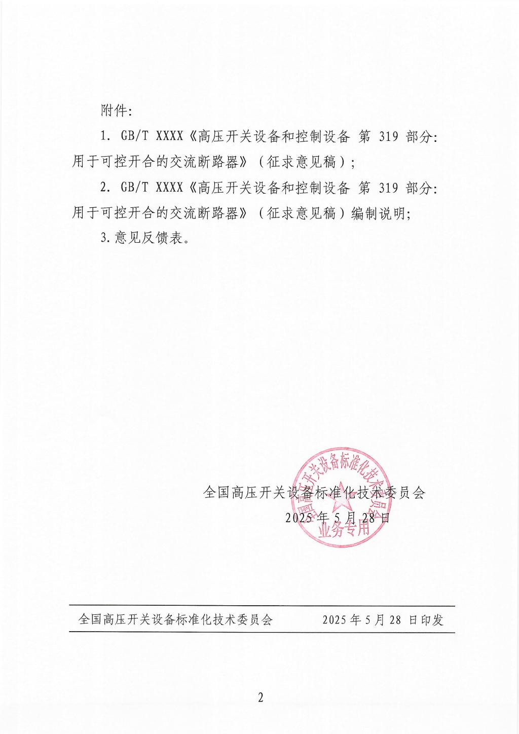 关于GBT高压开关设备和控制设备第319部分 用于可控开合的交流断路器(征求意见稿)征求意见的通知