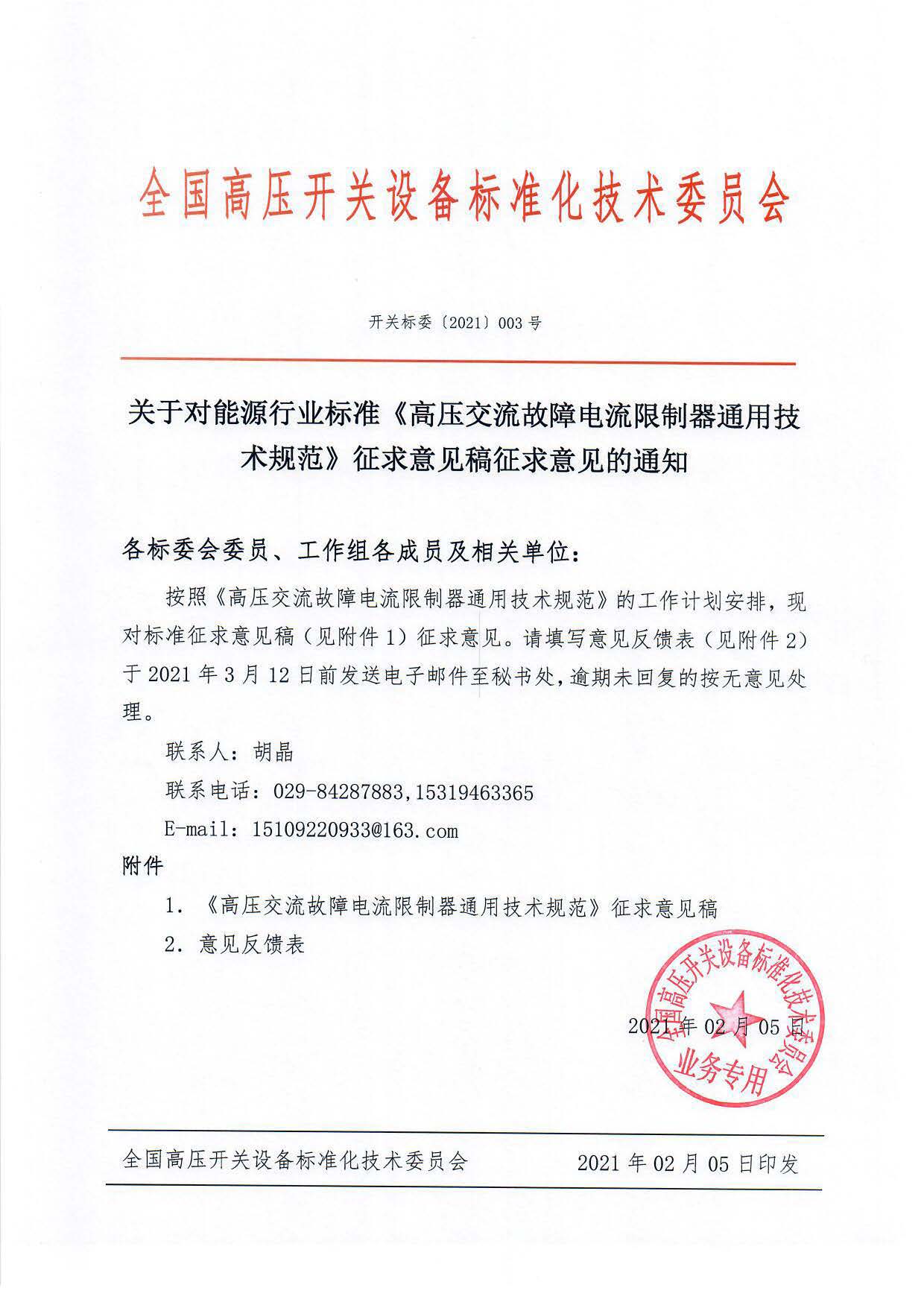 关千对能源行业标准《高压交流故障电流限制器通用技术规范》征求意见稿征求意见的通知