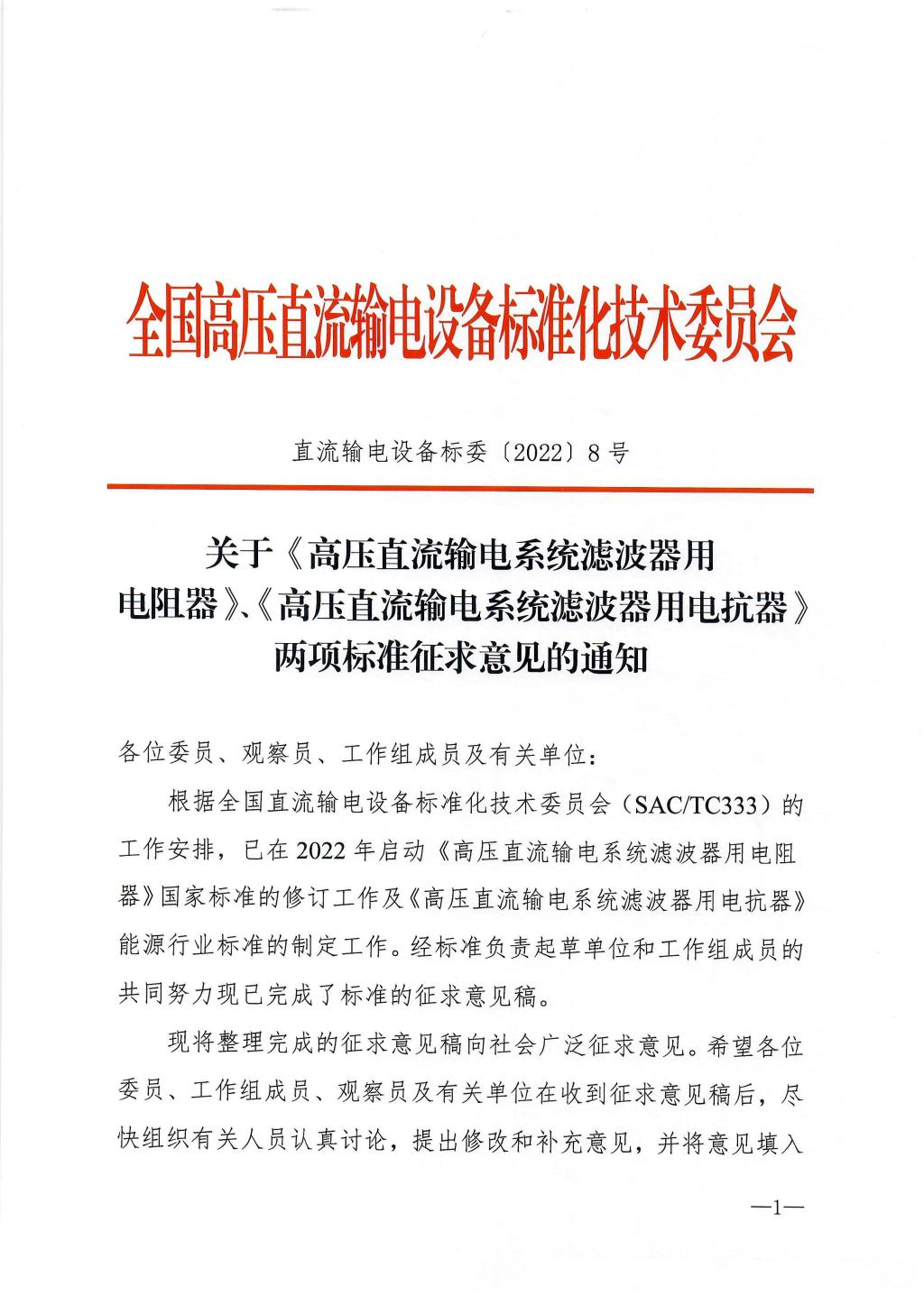 关于《高压直流输电系统滤波器用电阻器》、《高压直流输电系统滤波器用电抗器》两项标准征求意见的通知
