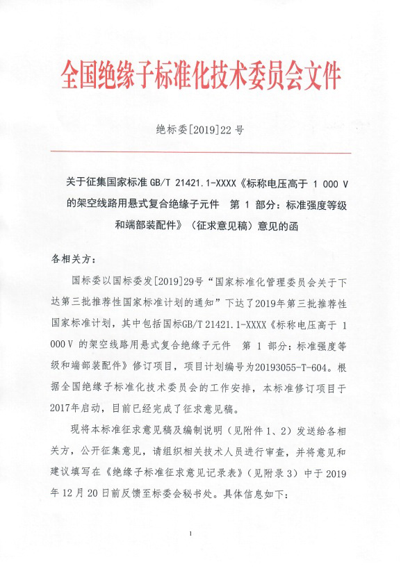 征集GB/T XXXXX《高压交流和直流系统用混合绝缘子—定义、试验方法和判定准则》等两项绝缘子