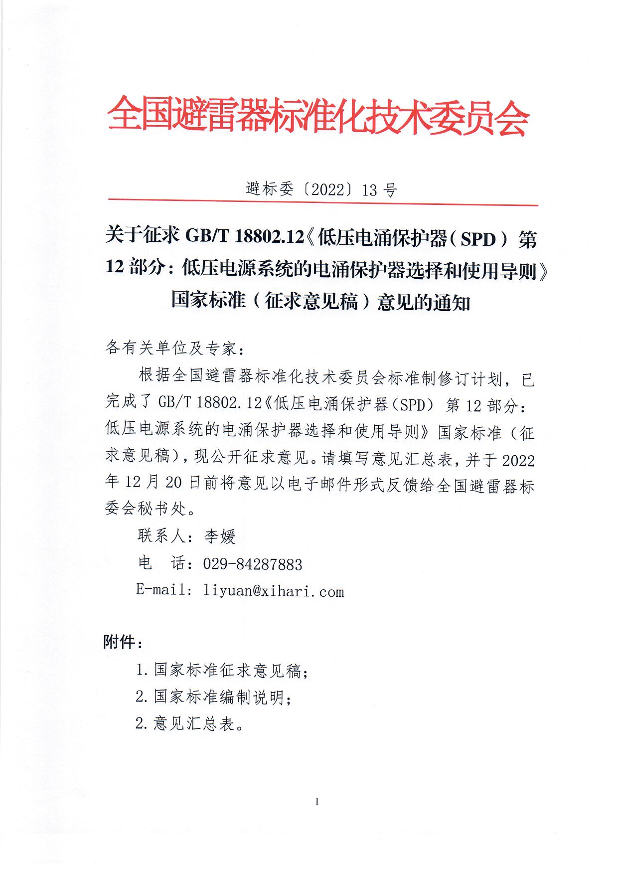 关于征求GBT 18802.12《低压电涌保护器(SPD) 第12部分:低压电源系统的电涌保护器选择和使用导则》国家标准