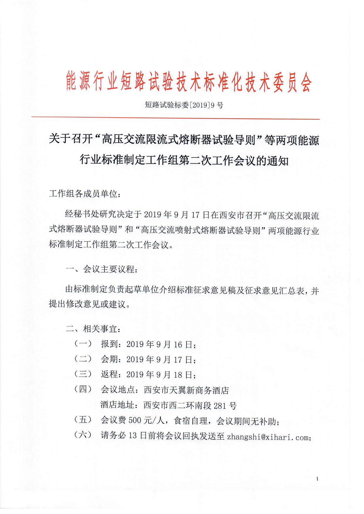 关于“高压交流限流式熔断器试验导则”等两项能源行业标准制定第二次工作组会议的通知