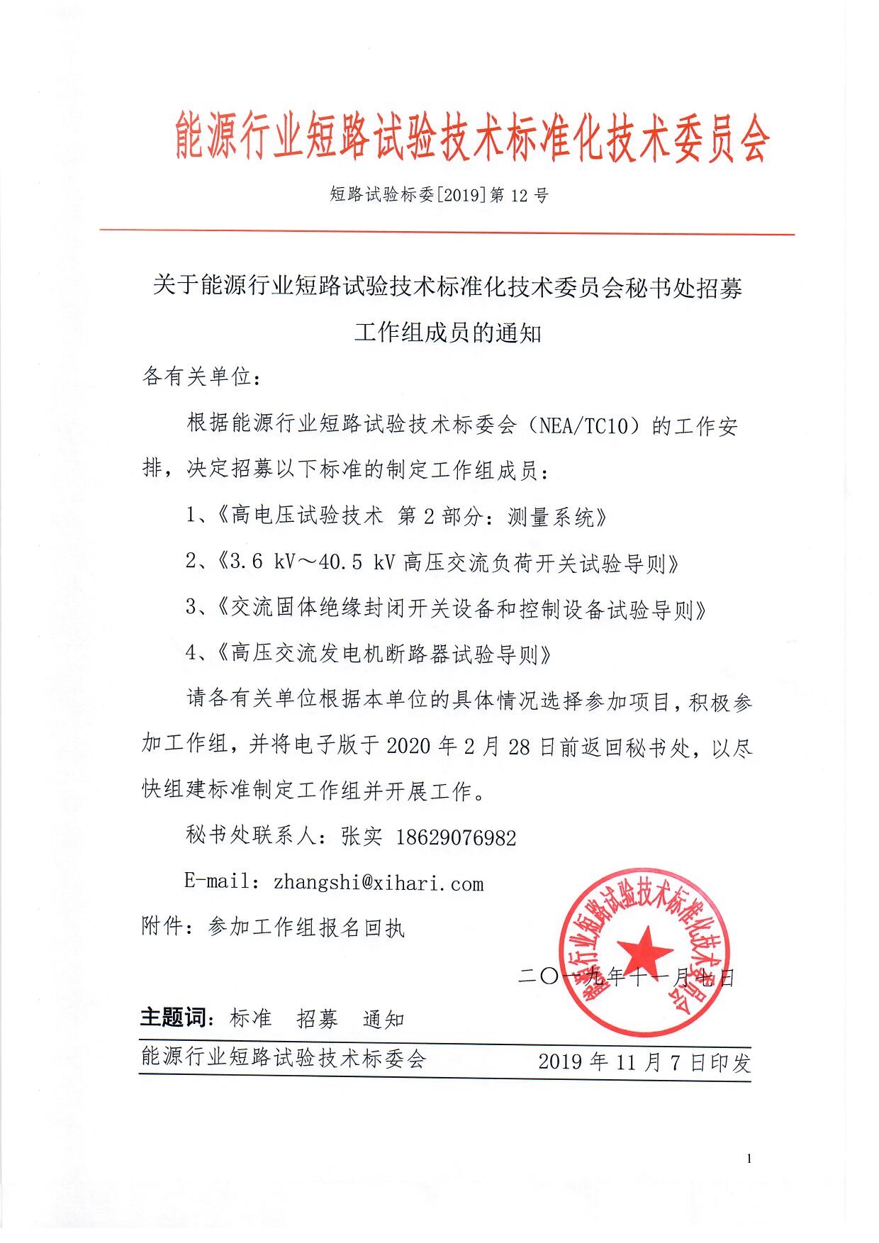 关于能源行业短路试验技术标委会2020年招募工作组成员的通知