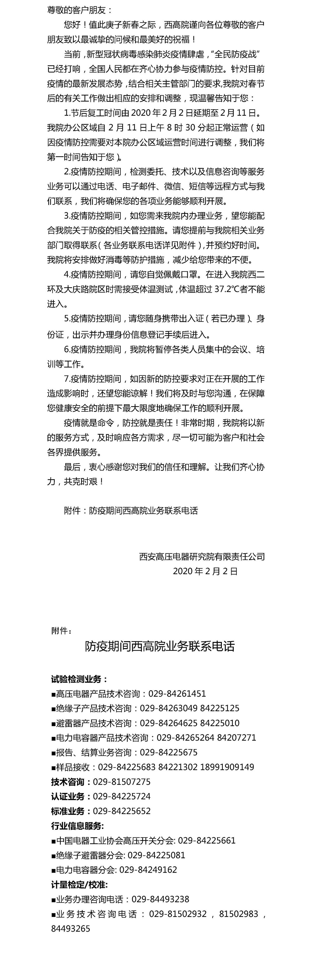西安高压电器研究院有限责任公司认证机构关于在新型冠状病毒感染肺炎疫情防控期间产品认证工作的公告