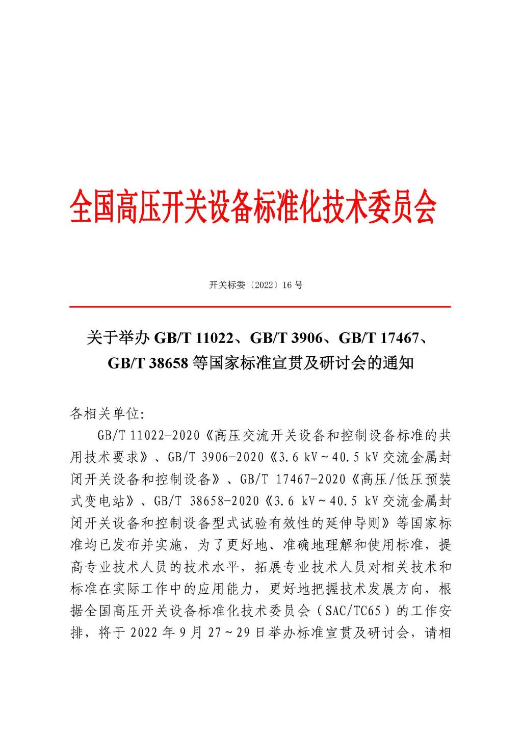 2022-016关于高压开关标准宣贯研讨会的正式通知