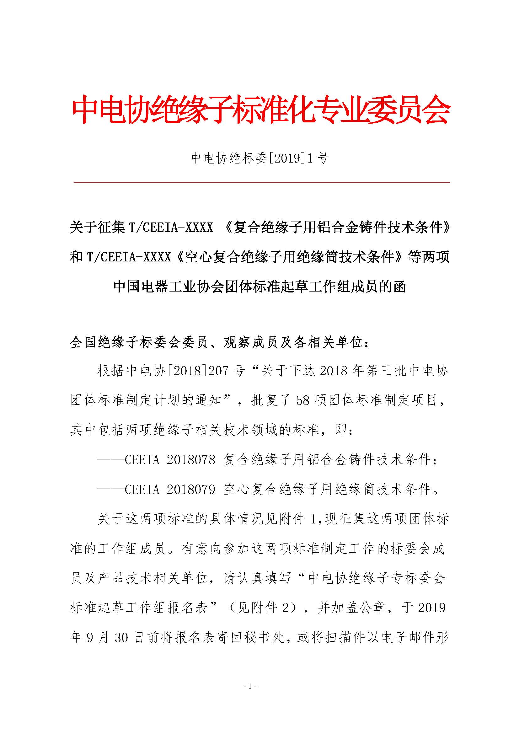 征集T/CEEIA-XXXX《复合绝缘子用铝合金铸件技术条件》和T/CEEIA《空心复合绝缘子用绝缘筒技术条件》等两项中国电器工业协会团体标准起草工作组成员的通知